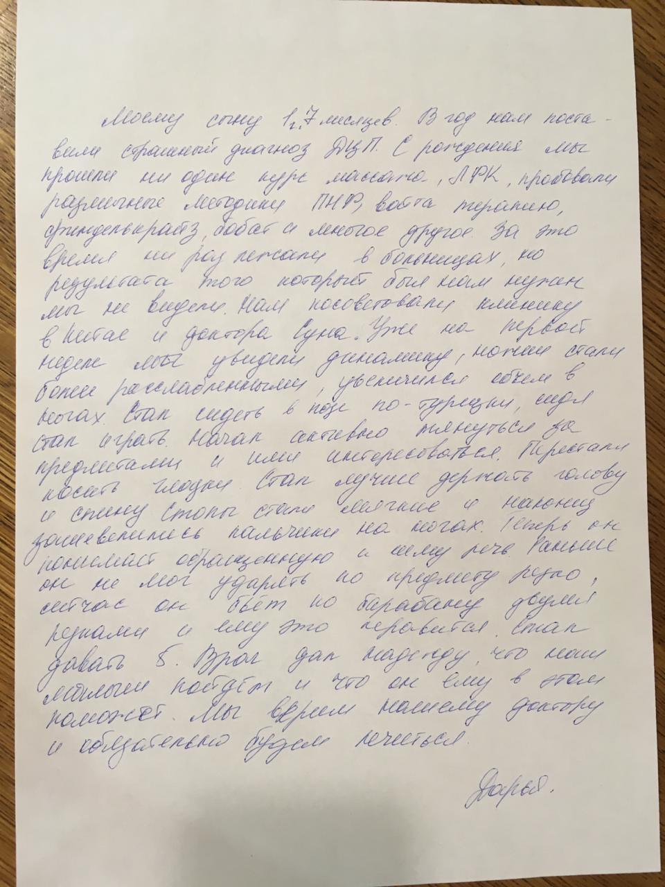 "Моему сыну 1 г и 7 месяцев. В год нам поставили страшный диагноз ДЦП. С рождения мы прошли не один курс массажа, ЛФК, пробовали различные методики ПНФ, войта терапию, финделькрайз, бобат и многое другое. За это время не раз лежали в больницах, но результата, того который был нам нужен, мы не видели. Нам посоветовали клинику в Китае и доктора Суна. Уже на первой неделе мы увидели динамику, ножки стали более расслабленными, увеличился объем в ногах. Стал сидеть в позе по-турецки, сидя стал играть. Начал активно тянуться за предметами и ими интересоваться. Перестали косить глазки. Стал лучше держать голову и спину. Стопы стали мягкие и наконец зашевелились пальчики на ногах. Теперь он понимает обращенную к нему речь. Раньше он не мог ударять по предмету резко, сейчас бьет по барабану двумя руками и ему это нравится. Стал давать «5». Врач дал надежду, что наш малыш пойдет и что он ему в этом поможет. Мы верим нашему доктору и обязательно будем лечиться."